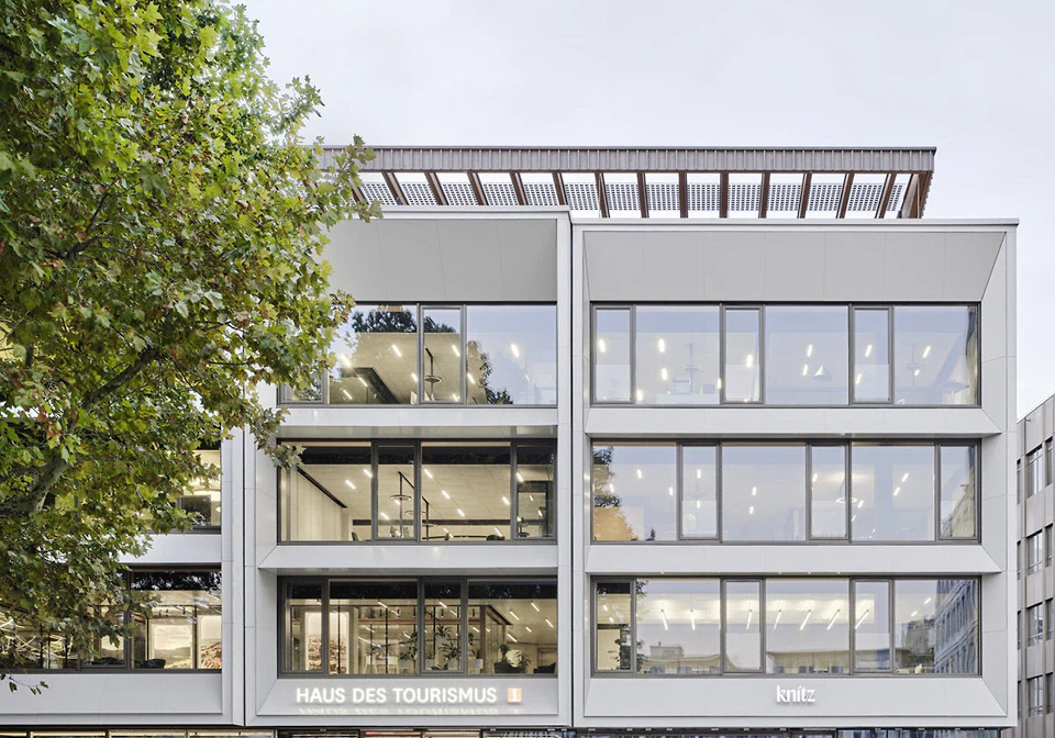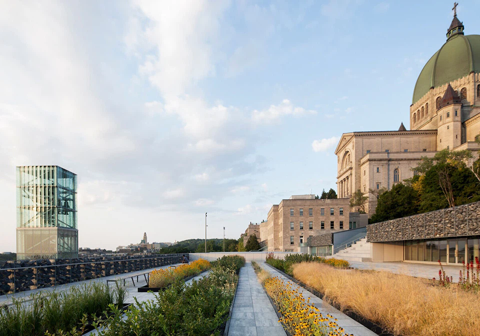 Der Neubau ersetzt ein provisorisches Empfangsgebäude. Was seine Gestaltung betrifft, stand Nachhaltigkeit ebenso im Fokus wie eine zeitgenössische, aber zugleich dezente Erscheinung. Mit Hanfbetonsteinen, einer teilweisen Fassadenverkleidung aus lokal bezogener Edelkastanie und einer freiliegenden Holzkonstruktion im Inneren versuchten die Architekt*innen, den CO₂-Fußabdruck der Bausubstanz zu minimieren. Das Dach ist extensiv begrünt, der Einsatz von Kunststoffen wurde so weit als möglich vermieden.