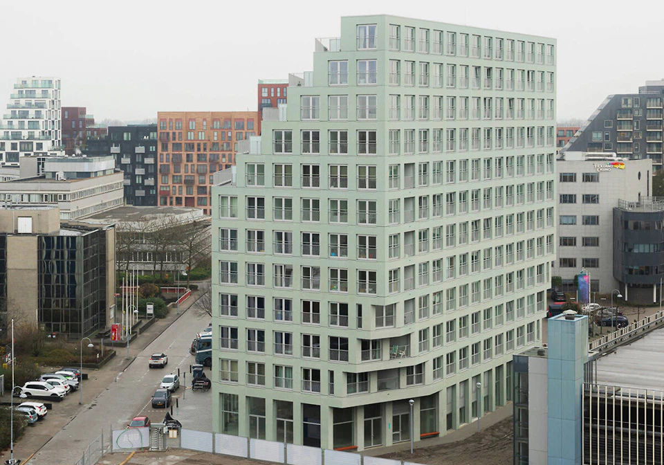 „Für uns ist es ein besonderes Projekt“, schreibt Ernst Scharf von W&V Architekten, „da es ein sozialer Wohnungsbau mit 100 Einheiten ist, bei dem dennoch eine überdurchschnittliche Gestaltungsqualität möglich war.“ Am offensichtlichsten wird das an der mintgrünen Fassade aus Glasurkeramik, die sich in den Treppenhäusern fortsetzt. Hinzu kommt die Gliederung der Großfigur durch leicht vorspringende und erhöhte Treppenhaustürme mit auffälligen Bullaugen. Zum neu begrünten Hof öffnet sich der Riegel mit Laubengängen, die nach dem Willen der Architekt*innen nachbarschaftliche Begegnungen fördern sollen. Die Kosten werden mit 23,3 Millionen Euro für die Kostengruppen 200–700 angegeben, bei einer Förderquote von 40 Prozent. (fh)