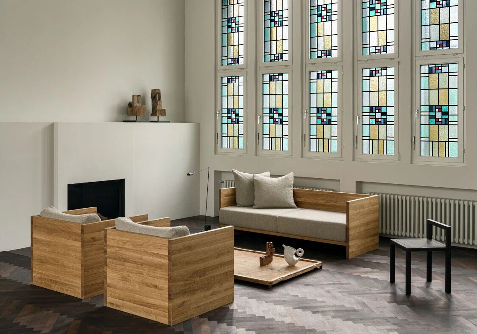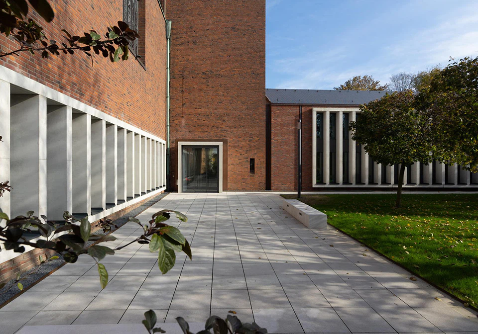 Um diesen Nutzungen gerecht zu werden, legten die Architekt*innen den Fokus auf die akustische und thermische Ertüchtigung des Bestands. Infolgedessen beschränken sich die Maßnahmen im Außenraum auf ein Minimum: Entlang der Südfassade führt ein weißer Betonsteg zum Eingang, eine Zusatzverglasung vor den Bestandsfenstern schützt vor dem Lärm der Hauptstraße. Die neuen Fensterrahmen, Geländer- und Türelemente sind in einem zurückhaltenden warmen Braunton gehalten.