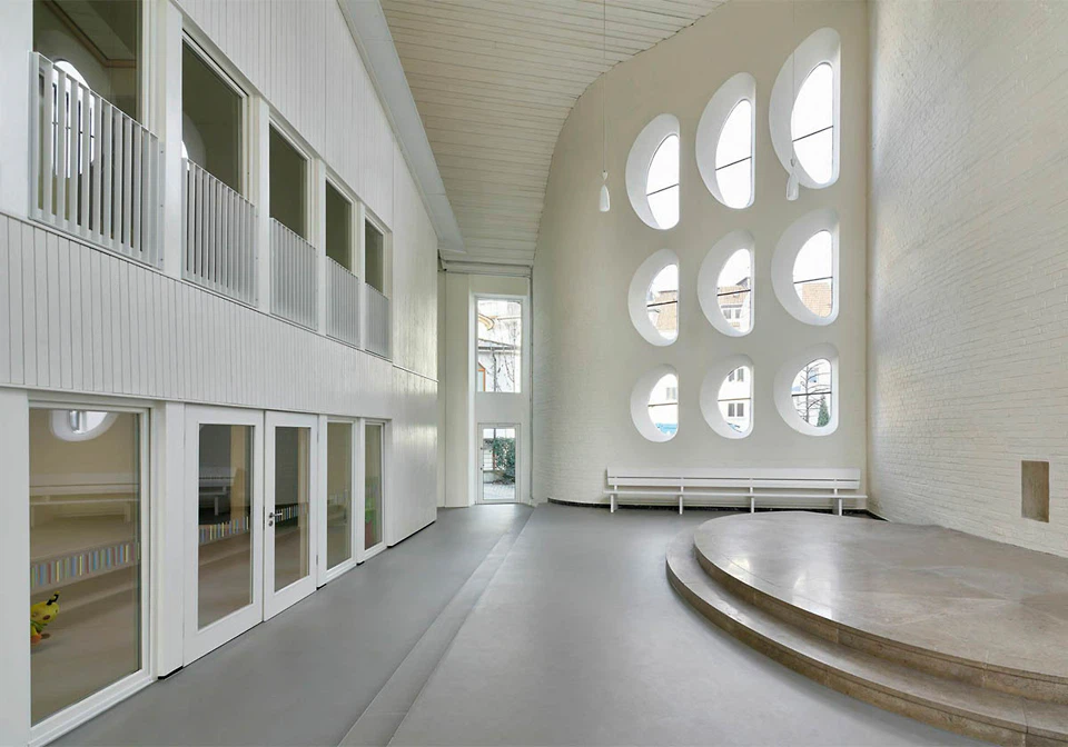 Im Inneren gliedert sich das Projekt in vier Bereiche. Der Haupteingang führt in die Eingangshalle, die direkt an den Saal im Hauptschiff angrenzt. Auf der gegenüberliegenden Seite befindet sich ein Foyer mit Bar sowie die Sanitär- und Garderobenbereiche für Besucher*innen. Weitere dienende Räume sind in einem niedrigen Vorbau mit drei Satteldächern entlang der Südfassade untergebracht.