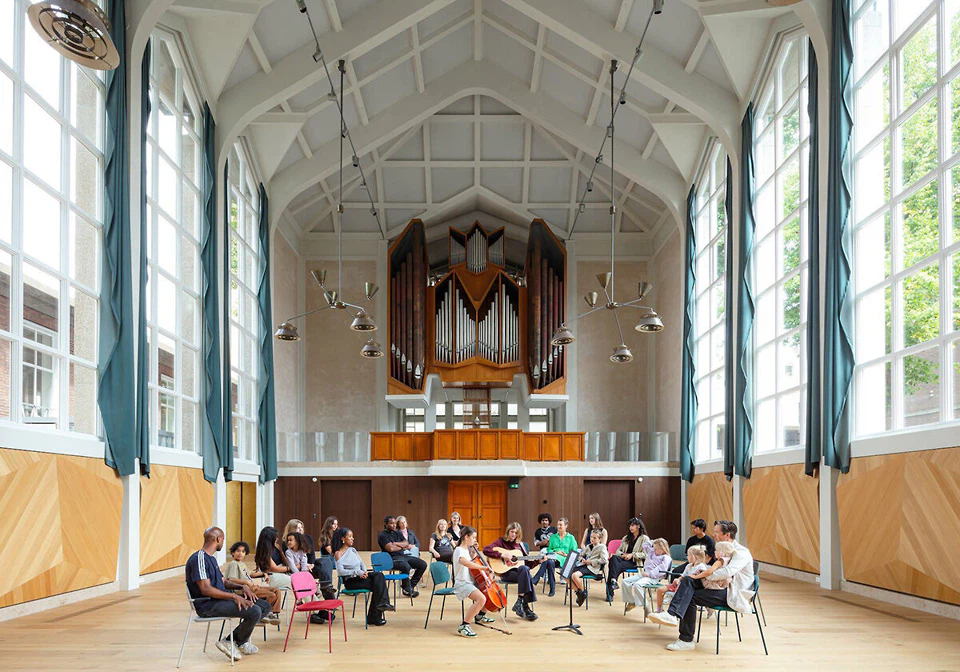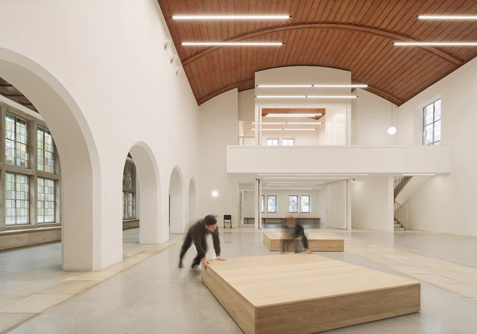 Der Hauptsaal ist mit einer versenkbaren Tribüne, wie man sie eher aus Sporthallen kennt, ausgestattet. Durch die flexiblen Sitzreihen lässt sich der Raum sowohl für Aufführungen als auch Ausstellungen nutzen, ohne dass ein größeres Stuhllager nötig wäre. An einer Metallstruktur an der Decke hängen runde Akustikreflektoren, die aus den Böden von Industriebehältern gefertigt wurden. Diese sollen den Schall optimieren. Das Gewölbe ließen die Planer*innen akustisch beflocken, was auch zur thermischen Isolierung beitragen soll. Ein Quarzsteinboden ersetzt das vormalige Eichenparkett, das man stattdessen zu Schallreflektoren für die Wände weiterverarbeitet hat. Im Bereich der Tribüne kommen zudem schwarze MDF-Paneele zum Einsatz.