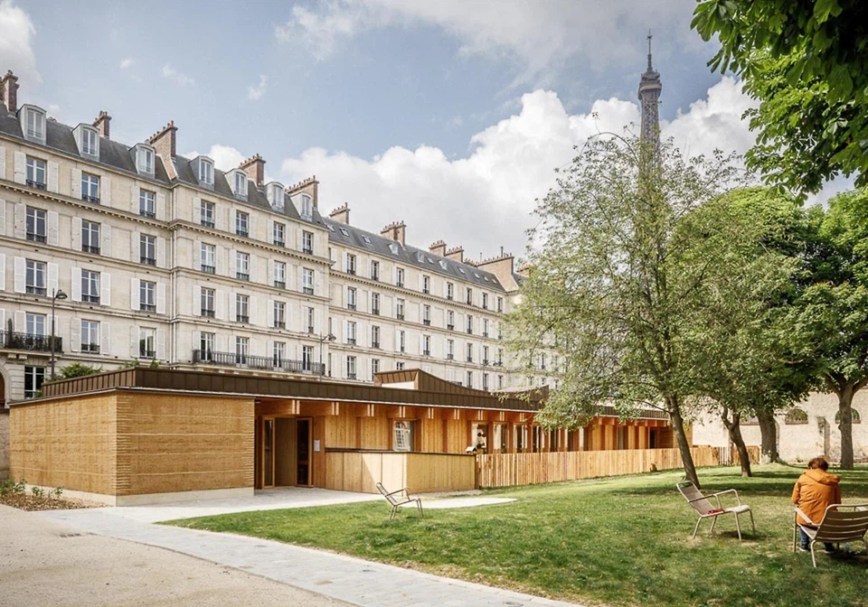 Évry-Courcouronnes ist nicht nur bekannt für Mario Bottas Kathedrale der Auferstehung. Weite Teile der Gemeinde im Großraum Paris sind von raumgreifenden Strukturen der Nachkriegszeit geprägt, beispielsweise den Bauten des Komplexes Les Pyramides, die sich über kreuzförmigen Grundrissen zu terrassierten Beton- und Ziegelgebirgen auftürmen. Diesem Kontext wollten HEMAA Architectes (Paris) eine neue Komponente hinzufügen. Sie nutzten den Auftrag der Kommune für das Parc des Loges Childhood and Sports Center, um ein flaches Ensemble aus Lehm und Holz zu realisieren.