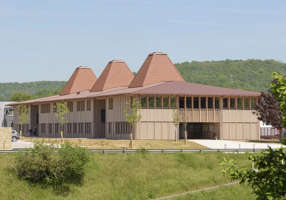 Die gut 2.400 Quadratmeter Bruttogrundfläche umfassende Anlage befindet sich zwischen den Pyramidenbauten und einem Park samt Sportplatz. Grün gibt es auf beiden Seiten reichlich, denn die rauen Gebilde aus den 1970er Jahren verstehen es durchaus, sich hinter Bäumen zu verstecken. Auch das Team um Charles Hesters und Pierre Martin-Saint-Etienne, die HEMAA 2018 gründeten, hat seine Baukörper mit sanft geschwungenen Dächern in neue Vegetation eingebettet. Die ist auf den Fotos zwar noch nicht angewachsen, soll aber zu einer natürlichen Lern- und Freizeitlandschaft für die Kinder werden.