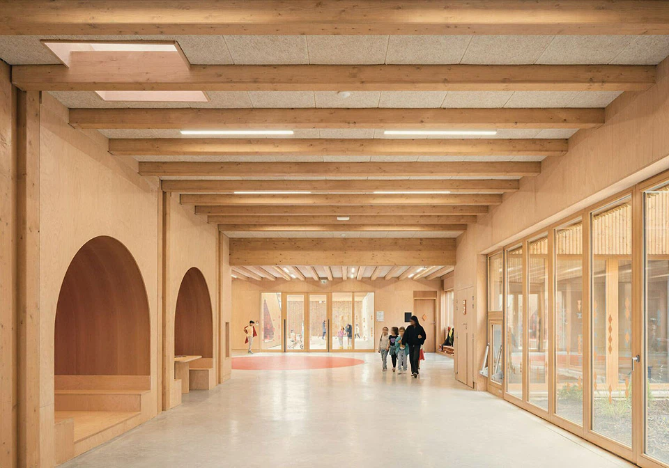665 Kubikmeter Lehm verarbeitete man zusammen mit den Spezialist*innen von BETerre. Die Erde stammt aus dem Tunnelaushub der Grand Paris Metro. Innen sind die tragenden Lehmwände mit Hanfwolle gedämmt. Dachkonstruktion, Stützen und Trennwände bestehen aus Holz, die Sockelzone aus kohlenstoffarmem Beton. Abseits von ökologischen Beweggründen steht hinter dieser Materialpalette auch das Ziel, den Kindern eine warme und lebendige Umgebung zu schaffen. Wie HEMAA sagen, als bewusster Kontrast zum betongeprägten Umfeld. (mh)