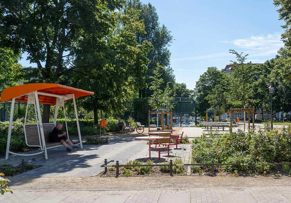 Auch der Platzbelag folgt der Logik der Baumpflanzungen. Die Fläche wurde mit Porphyrquadern gepflastert, deren Verlegung die kreisförmige Geometrie der Pflanzinseln aufnimmt und in konzentrischen Mustern über den Platz zieht. Stufen, Rampen oder sonstige Unterbrechungen gibt es nicht. Dass für den Belag Porphyr gewählt wurde, ist dabei nicht nur eine ästhetische Entscheidung. Der Naturstein fügt sich plausibel in den historischen Stadtraum ein und unterstützt zugleich das Regenwassermanagement. Unter den Bauminseln befindet sich eine Speicherschicht, die Wasser nach dem Schwammstadt-Prinzip sammelt und den Bäumen zeitversetzt wieder zur Verfügung stellt.