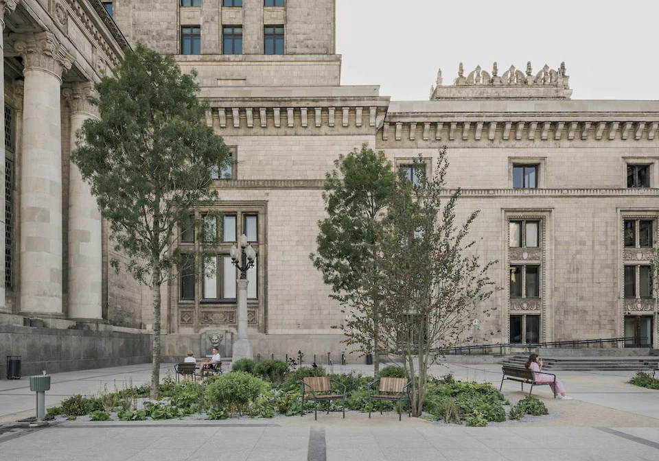 Die Hauptakteure der Neugestaltung sind dabei Bäume, genauer Platanen. Mit ihren dichten Kronen spenden sie Schatten, sind hitzeverträglich und versprechen vergleichsweise schnell räumliche Wirkung. Gepflanzt wurden sie allerdings nicht ebenerdig, sondern in rund einen Meter hohe, stumpfkegelförmige Aufschüttungen. Die Lösung ist weniger gestalterische Geste als pragmatische Antwort auf den Bestand im Untergrund. Versorgungsleitungen, alte Fundamente und archäologische Überreste ließen tiefere Eingriffe nicht zu. Also wurden die Bäume – die als sogenannte Herzwurzler sowohl in die Breite als auch Tiefe wurzeln – kurzerhand ein wenig nach oben verlagert, schrieben die Architekt*innen. Diese Entscheidung verleiht dem Projekt seine eigentümliche räumliche Logik.