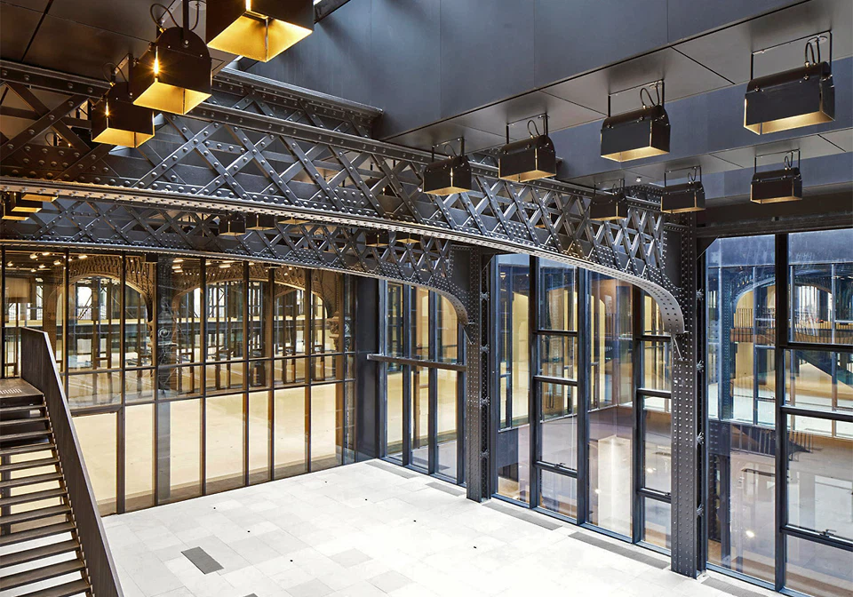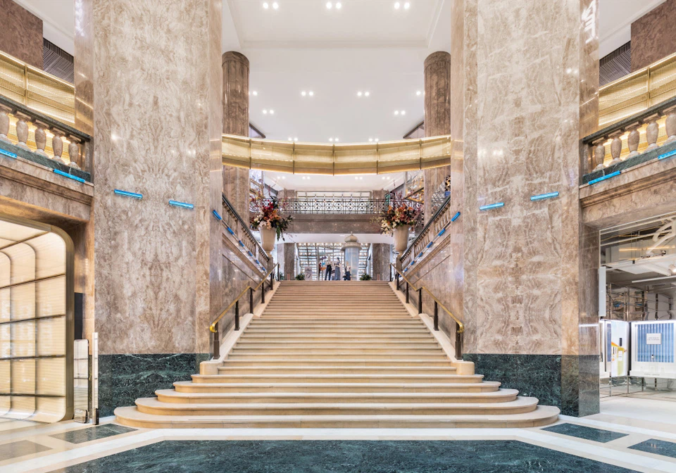Bestimmendes Thema bei der Umgestaltung im Erdgeschoss war die Öffnung zum Straßenraum. Die Eingangshalle erhielt eine Auffrischung, außerdem wurden Zwischenetagen entfernt, um großzügige Räume mit doppelter Deckenhöhe zu schaffen. Eine Wiederverwendung vorhandener Materialien stand dabei im Mittelpunkt. Beispielsweise löste man zu entfernende Steine von Hand mit Diamantsägen heraus, um sie erneut nutzen zu können.