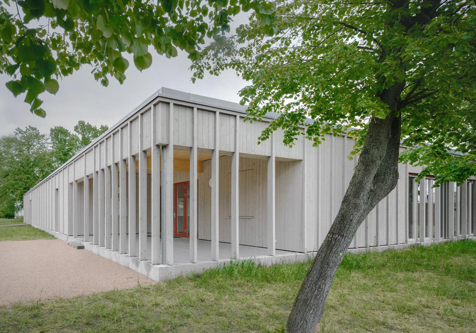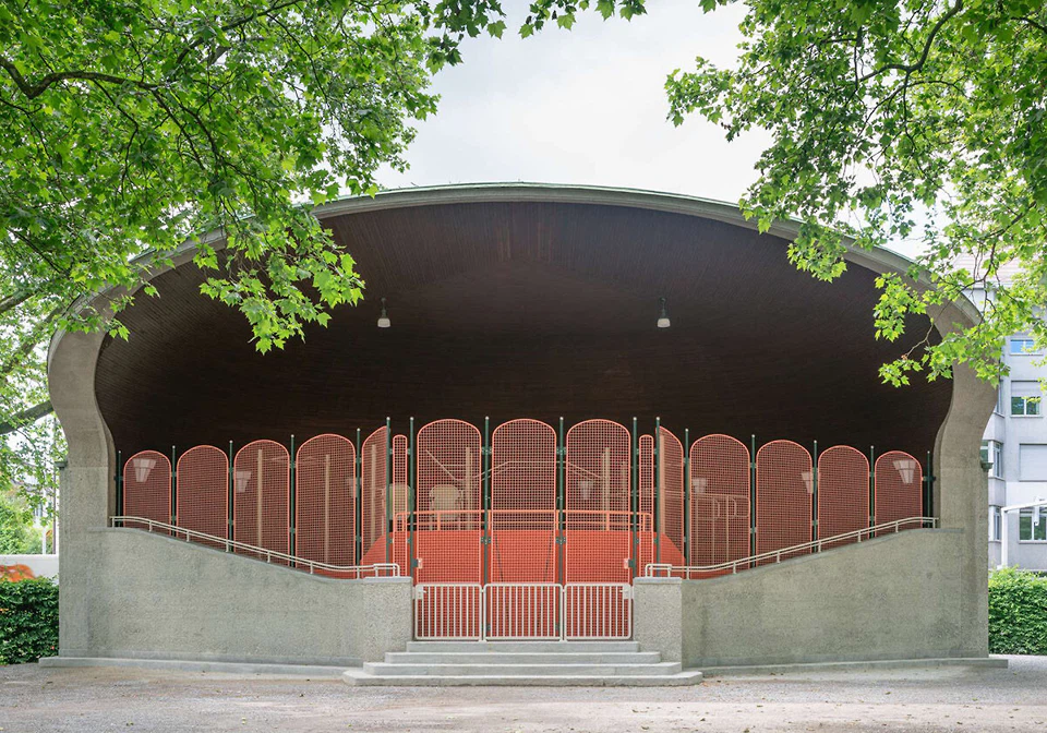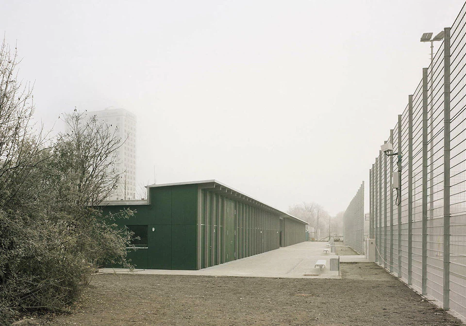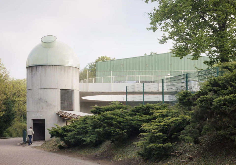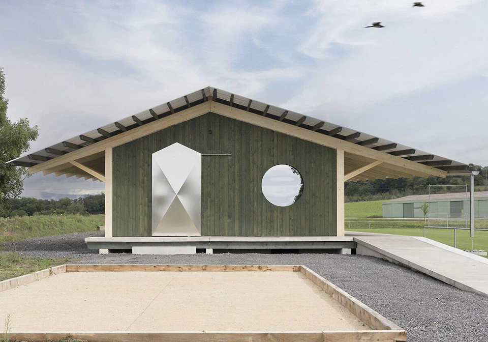 Das baskische Büro fügte den 150 Quadratmeter kleinen Bau in ein am Waldrand gelegenes Ensemble ein, zu dem bereits mehrere Gebäude für sportliche Aktivitäten, aber auch eine Kirche gehören. Die Architekt*innen positionierten ihre Halle für Gymnastik und Tanz zwischen eine Frontón-Halle – die der baskischen Squash-Variante Pelota dient – und eine Bolatoki-Anlage – eine einfache Bahn für das baskische Kegelspiel Bolo. Der Neubau lehnt an einer bestehenden Rückwand Richtung Wald und nutzt einen Teil der benachbarten Halle für die Umkleiden.