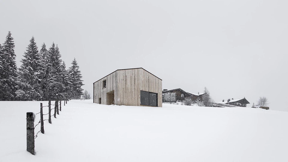 Der zwischen den vier Silos eingestellte Holzbau mit klassischem Satteldach erhält durch die brutalistischen Türme eine riesenhafte, fast schon überzeichnete Anmutung – auch wenn es sich letztlich um einen regulären Dreigeschosser mit circa 325 Quadratmetern Bruttogrundfläche handelt. Teil des Projekts war außerdem ein neues Stallgebäude mit rund 390 Quadratmetern Fläche, das mit gebührendem Abstand neben dem burgartigen Wohnsolitär errichtet wurde.