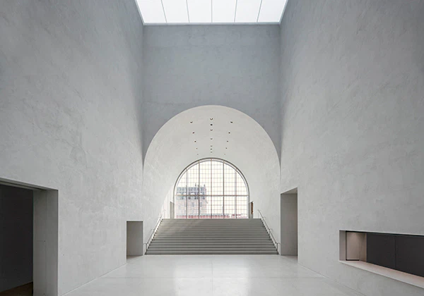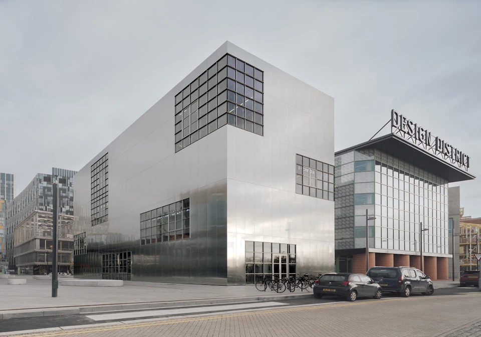 In Stahl, Glas und Beton zeigt sich die dazu passende Corporate Architecture. Ob der Geometrie gibt es quasi keine Dachfläche, alles ist Fassade. Diese spiegele die Markenkerne Leichtigkeit, Effizienz und technologische Innovationsfreude wider, erklären Barozzi Veiga. Die perforierten Metallpaneele sind so ausgerichtet, dass sie an den schrägen Flächen im Sommer als Sonnenschutz dienen, während sie im Winter solare Wärmegewinne zulassen. Durch die „akkordeonartige“ Faltung des Konstrukts aus Stahlhohlprofilen erhöhe sich zudem die Steifigkeit der tragenden Fassade. Geplant wurde sie gemeinsam mit knippershelbig (Stuttgart u. a.).