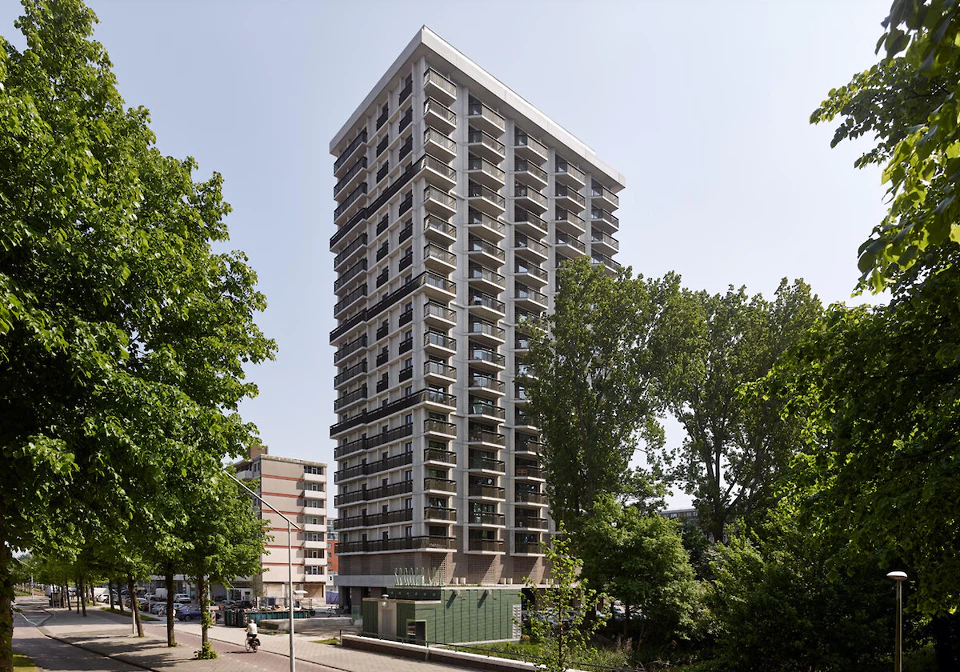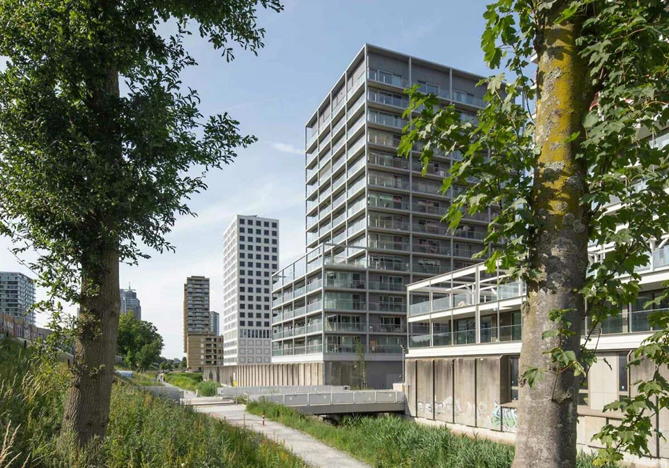 Dem anspruchsvollen Standort an der viel befahrenen Cornelis Lelylaan begegnet das schmale, lange Haus dabei mit zwei unterschiedlichen Gesichtern. Streng schaut die glatte, verklinkerte Nordfassade auf die Straße. Nach Süden hingegen löst sich das Gebäude auf in einen bis zu vier Geschosse hohen Sockel, in dem neben Wohnungen auch eine Kindertagesstätte, eine außerschulische Betreuungseinrichtung, Ateliers und Gastronomie untergebracht sind. Den oberen Abschluss dieses Sockels bildet die bereits erwähnte, abgetreppte „Gartenzone“. Für Sockel und Nordfassade wurde mit der Firma Deppe eine spezielle Ziegelmischung in Grau-, Grün- und sandfarbenen Tönen entwickelt, die sich auf die Farben der Umgebung beziehen.