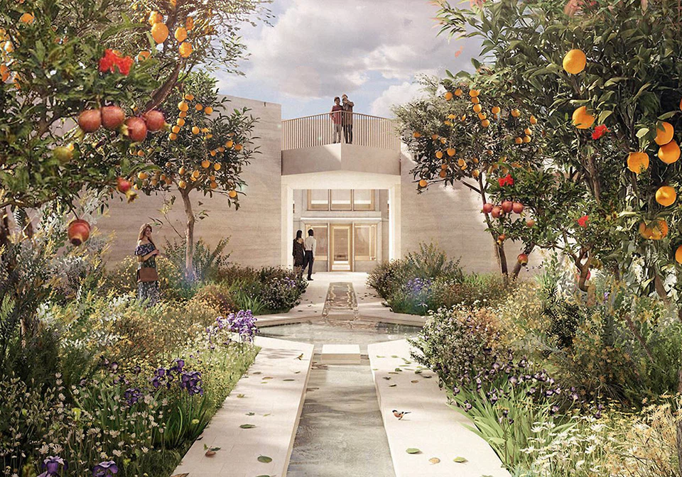 Hitze, spärliche Vegetation und der saisonale Wadi Kharrar prägen die Umgebung, während das grüne Ufer des Flusses einen Kontrast zu dieser kargen Landschaft bildet. Níall McLaughlin Architects schlagen ein als Pilgerreise angelegtes Konzept vor – eine Ost-West-Wegführung, bei der die Besuchenden von einem trockenen Wüstengarten in die Erde hinabsteigen, dann auf eine mit Wasser gefüllte Spalte stoßen, die den Jordan symbolisiert, und schließlich wieder ins Licht in einen „Paradiesgarten“ treten.