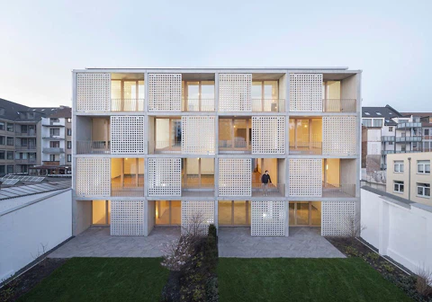 Zieht man die Austritte hingegen als Außenschicht über die komplette Fassade, kann ein Puffer zur möglicherweise lärmenden Nachbarschaft entstehen. Aretz Dürr Architektur gelang mit ihrem modularen Wohnhaus in Köln deutlich mehr Privatheit im nachverdichteten Innenhof. Noch intimere Austritte finden sich beim Wohnhaus in Düsseldorf von TRU Architekten, das diese mit Sonnen- und Sichtschutzelementen aus perforiertem Sichtbeton versahen.