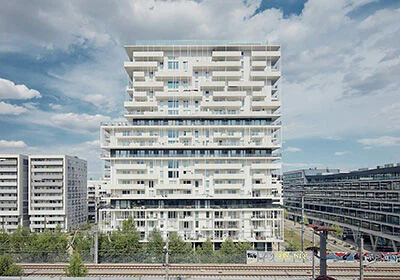 Als bauliches Anhängsel verleihen Balkone glatten Stadtschluchten Relief und Struktur. In Berlin versahen Thomas Baecker Bettina Kraus Architekten ein Baugruppenhaus mit halbrunden Varianten, die der streng gerasterten Fassade eine frische Anmutung geben. Beim Wohnhochhaus Taborama in Wien von querkraft architekten wirkt dieses Prinzip noch stärker. Hier erhielt nicht nur jede Wohnung einen individuellen Austritt, auch verhelfen drei sogenannte Zäsurgeschosse – eine jeweils umlaufende Balkonzone – dem großformatigen Baukörper zu einem menschlicheren Maßstab.